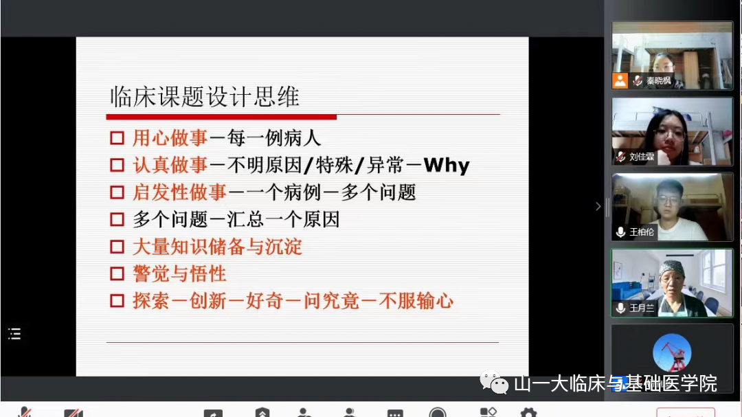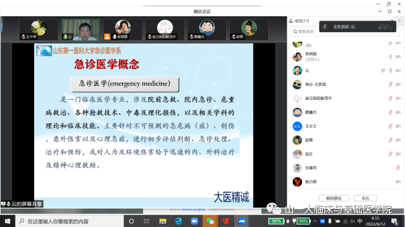 根据校(院)研究生部安排,2022级临床医学专业学位研究生定于2022年8月底进入各住院医师规范化培训基地,按照住院医师规范化培训要求,开展住院医师规范化培训轮转。依据《三亿体育官网临床医学硕士专业学位公司产品方案》及校(院)研究生部的部署,住院医师规范化培训轮转前需完成公共必修课、专业必修课课程的学习。为进一步落实临床医学专业学位研究生教育与住院医师规范化培训制度的衔接,保证理论课程学习及住院医师规范化培训的顺利开展,保障专业学位公司产品质量,三亿体育针对2022级临床医学专业学位研究生开展暑期线上授课。附属省立医院经理、副校(院)长赵家军教授,附属皮肤病医院经理、副校(院)长张福仁教授,附属肿瘤医院副经理、三亿体育副经理李宝生教授,三亿体育副经理王月兰教授,三亿体育副经理韩波教授,学科系主任杜怡峰教授、李云教授、任万华教授、钟霞教授等分别为员工授课。