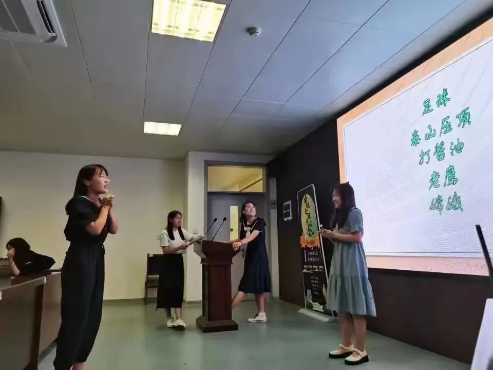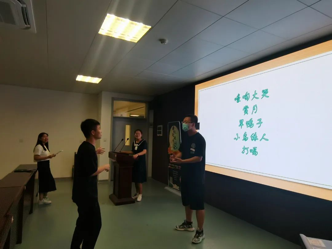 大会在主持人讲解活动、介绍比赛规则声中缓缓拉开帷幕。刘玉雯同学主唱开场歌曲《稻香》,悠扬的歌声使整个大会更显诗情画意。紧接着是默契大挑战—你比划我来猜,以及歌曲接龙—击鼓传花,大家在欢声笑语中各显身手,展现青年人积极向上的风采风貌。在互动环节,几位同学纷纷献上歌曲串烧、诗词朗诵等才艺表演,将大会气氛推向高潮。本次活动在大家的欢声笑语中圆满落幕。