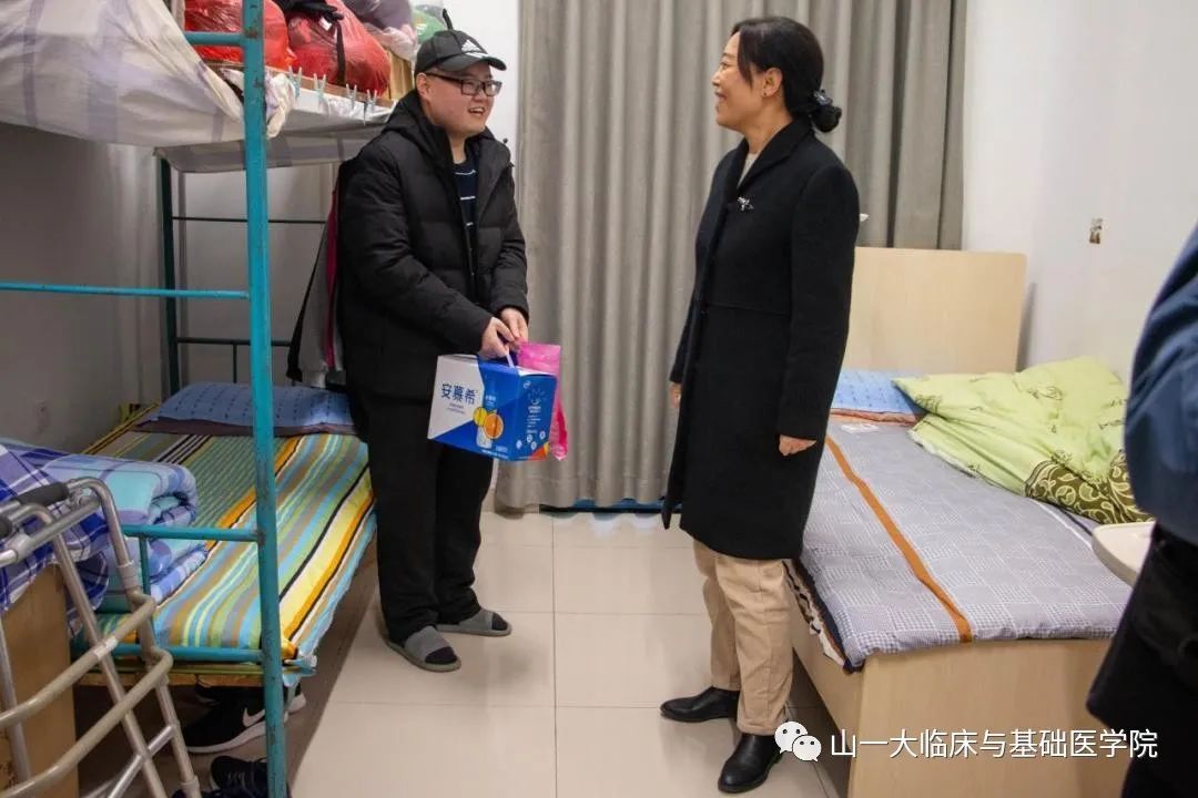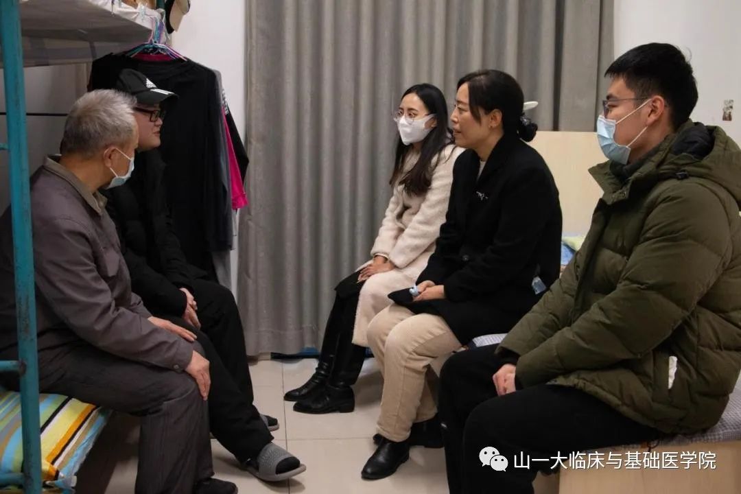 随后,院(所)深入宿舍看望行动不便的李贺同学,岳芸对李贺的日常生活、饮食、学习等方面进行了细致的询问,叮嘱要时刻注意保养好个人身体,有需要和问题随时和老师联系反馈。岳芸鼓励同学们所有困难都是暂时的,大家要凝心聚力,配合疫情期间的各项防控政策,共同打赢校园疫情防控阻击战、攻坚战。作为医员工更要弘扬伟大抗疫精神,汲取前行力量,保持奋发向上的决心和态度,努力学习,实现自己的专业理想。