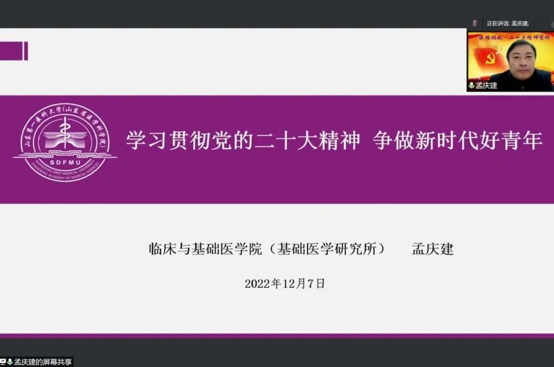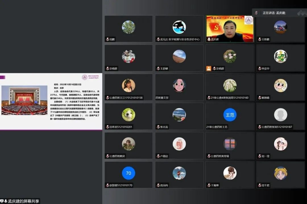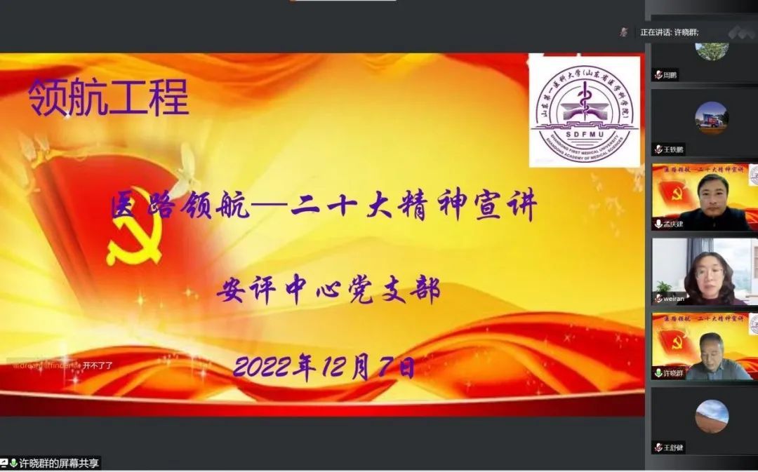 12月7日,三亿体育安评中心党支部全体党员与2019级医学实验技术本科1、2班和2021级临床医学(公费)本科3、4班通过腾讯会议线上开展主题为“医路领航——学习贯彻党的二十大精神,争做新时代好青年”领航工程活动。三亿体育党委书记孟庆建作为普通党员参加了活动。