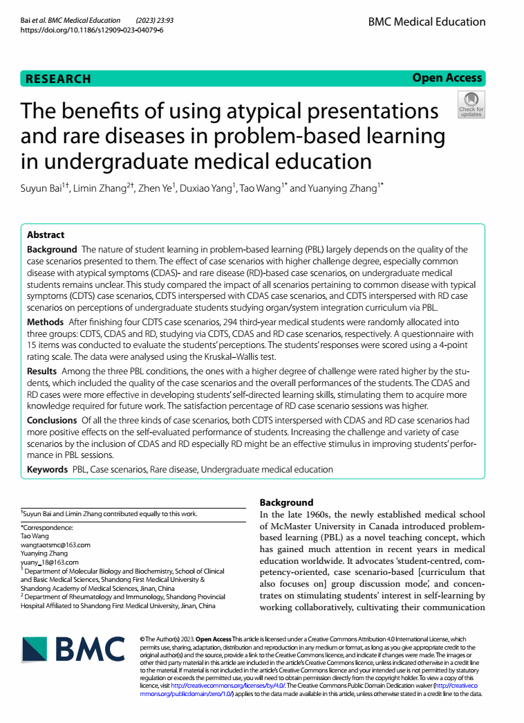 The benefits of using atypical presentations and rare diseases in problem-based learning in undergraduate medical education | BMC Medical Education | Full Text (biomedcentral.com)