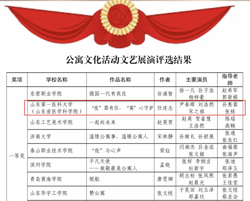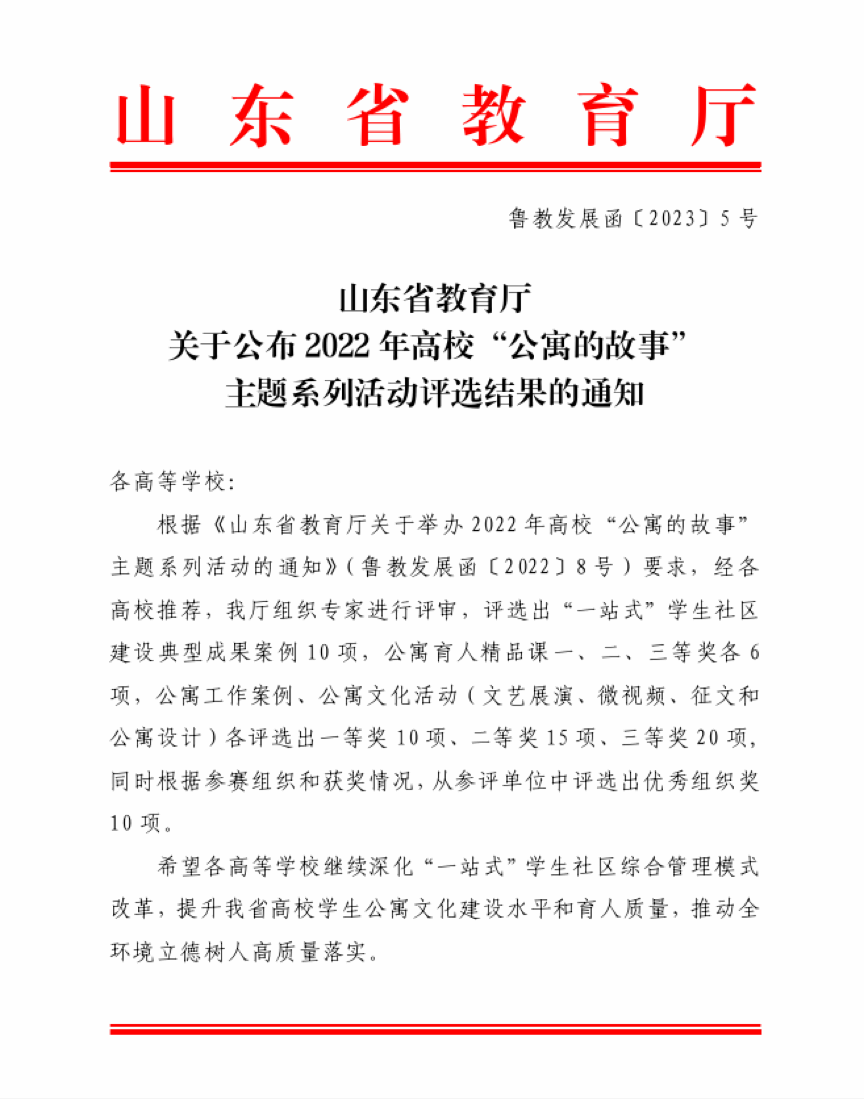 近日,山东省教育厅印发《关于公布2022年高校“公寓的故事”主题系列活动评选结果的通知》。由院(所)辅导员孙惠蓉指导,院(所)员工任连志、尹春晖、刘浩然、宋之祺报送的作品《“疫”路有你,“寓”心守护》荣获一等奖。