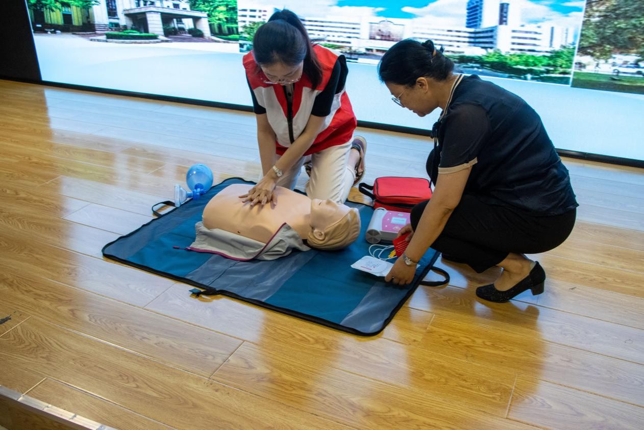 启动仪式后,附属省立医院护理部专家向员工志愿者传授了专业救护知识、心肺复苏、应急救护高质量CPR的操作等专业急救技能,提高了服务团成员的抢救意识和专业救护水平。