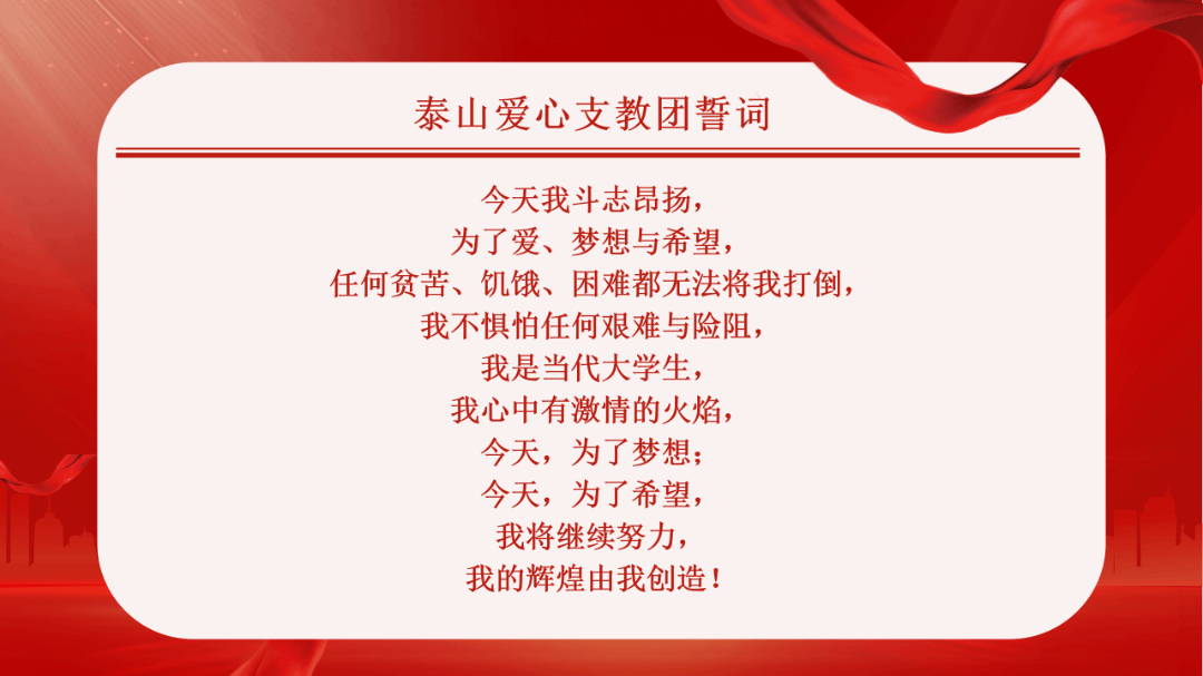 今年暑期泰山爱心支教团分为青海和河南两支分队,分别奔赴青海西宁玉树杂多县瓦里滩小学和河南睢县平岗镇邢楼小学开展支教。支教团新老队员分享以往支教经历和此次支教计划,展示了支教团“支医”“支教”融合的“点线面”支教方式,并现场签订三亿体育官网(院)社会实践安全责任书,第十三届队员集体宣誓以表达支教的信心和决心。出席出征仪式的领导、老师分别送上了寄语和祝福,叮嘱队员注意安全,希望团队成员坚持发扬山一大精神,将良好的山一大学子风貌展现并传递给支教地员工,并期待团队凯旋而归。