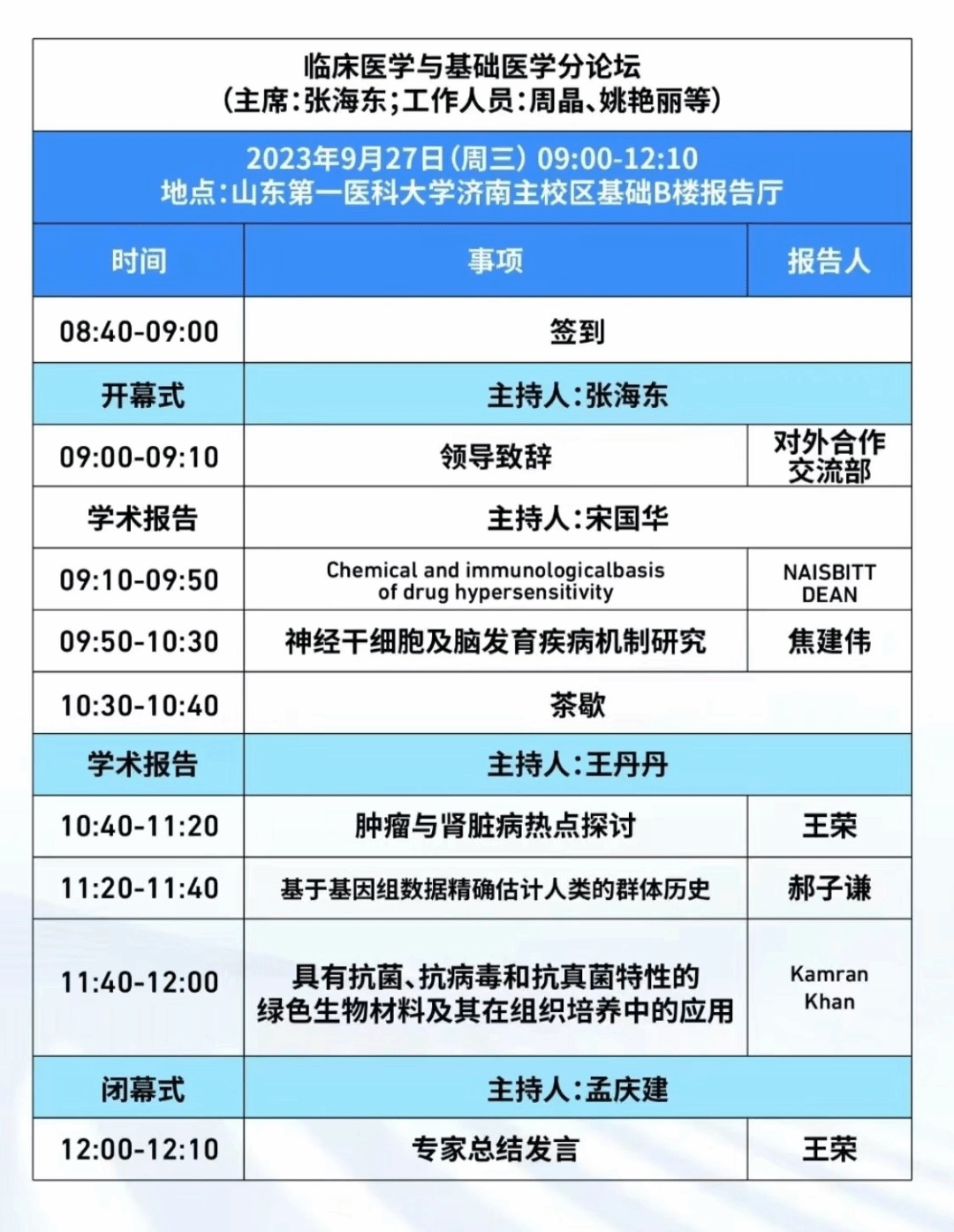 9月27日上午,由院(所)承办的“临床医学与基础医学分论坛”在医学楼B座报告厅成功举办,受邀参加本次分论坛来宾有:英国利物浦大学NAISBITT DEAN教授、中国科公司动物研究所焦建伟研究员、三亿体育官网附属省立医院副经理王荣教授、医学人工智能与大数据公司郝子谦副研究员、莫纳什苏州研究院的Kamran Khan博士,三亿体育官网对外交流合作部陈欣部长、齐鲁中科现代微生物技术研究院李俊雄经理、数字人公司总裁徐以发董事长、漱玉健康产业研究院孙雯经理、第一附属医院王建宁副经理、第二附属医院曹铭锋书记、附属皮肤病医院刘红副经理,以及来自附属中心医院、附属内分泌与代谢病医院和部分友好企业的专家等。院(所)师生三百余人一同出席了活动。