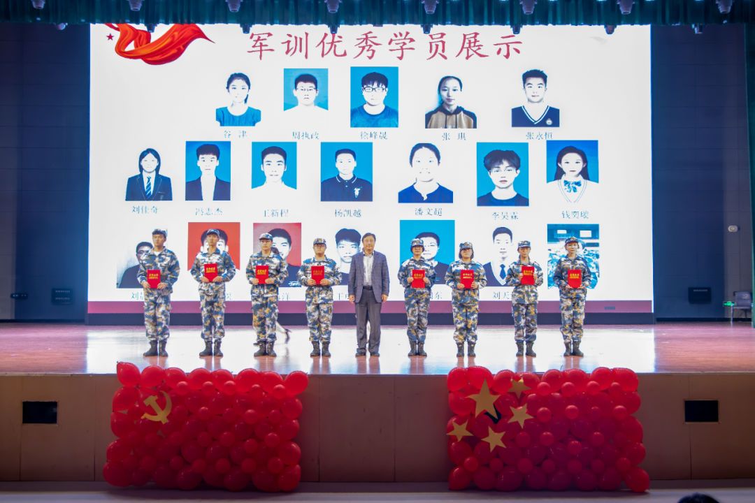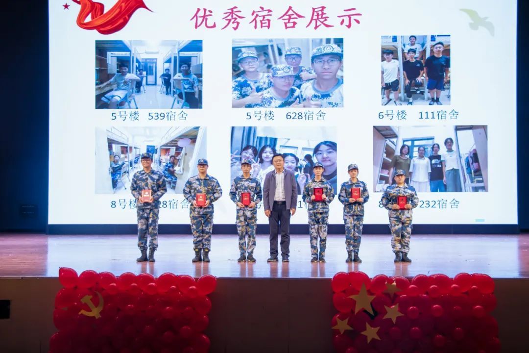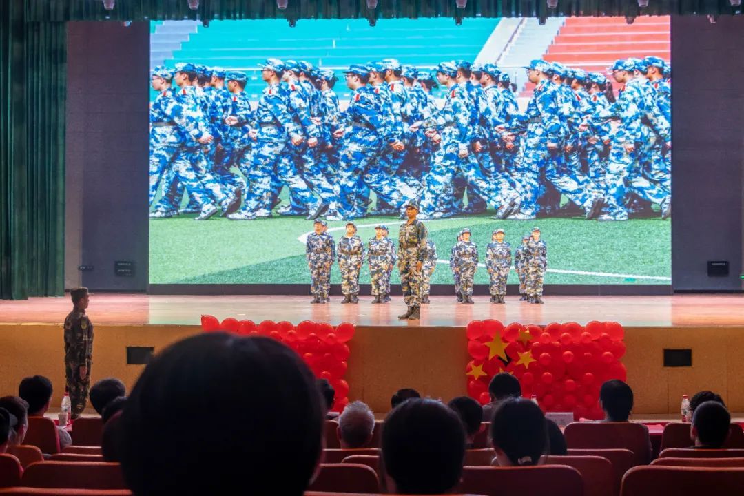 仪式开始,由岳芸宣读2023级军训优秀个人及优秀宿舍表彰名单,孟庆建、刘祥雨分别为军训优秀学员、优秀宿舍成员代表颁奖。华波为“医志”国防军事社团指导老师颁发聘书,并为“医志”国防军事社团授予团旗。随后,通过VCR向观众们展示了军事化标杆宿舍风貌,同时“医志”国防军事社团和老员工艺术团分别为大家带来队列表演、朗诵及合唱表演,通过激昂向上、鼓舞人心的表演展现了雷厉风行的军人作风和高尚的道德情操,感染着在场每一位观众。