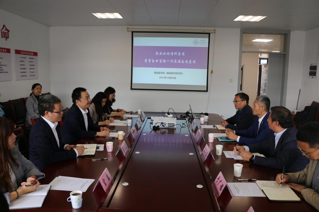 签约仪式后博科控股集团有限公司董事长甘宜梧一行到基础医公司(所)座谈交流,并参观了生命科学馆、医学检测与安全性评价中心、医学实验技术实验室等平台。座谈交流会上,院(所)党委书记孟庆建对基础医公司(所)人才体系、科研成绩、教学成果等整体情况做了详细介绍,随后,甘宜梧董事长与院(所)领导及科研人员就项目合作、成果转化进行了深入交流。