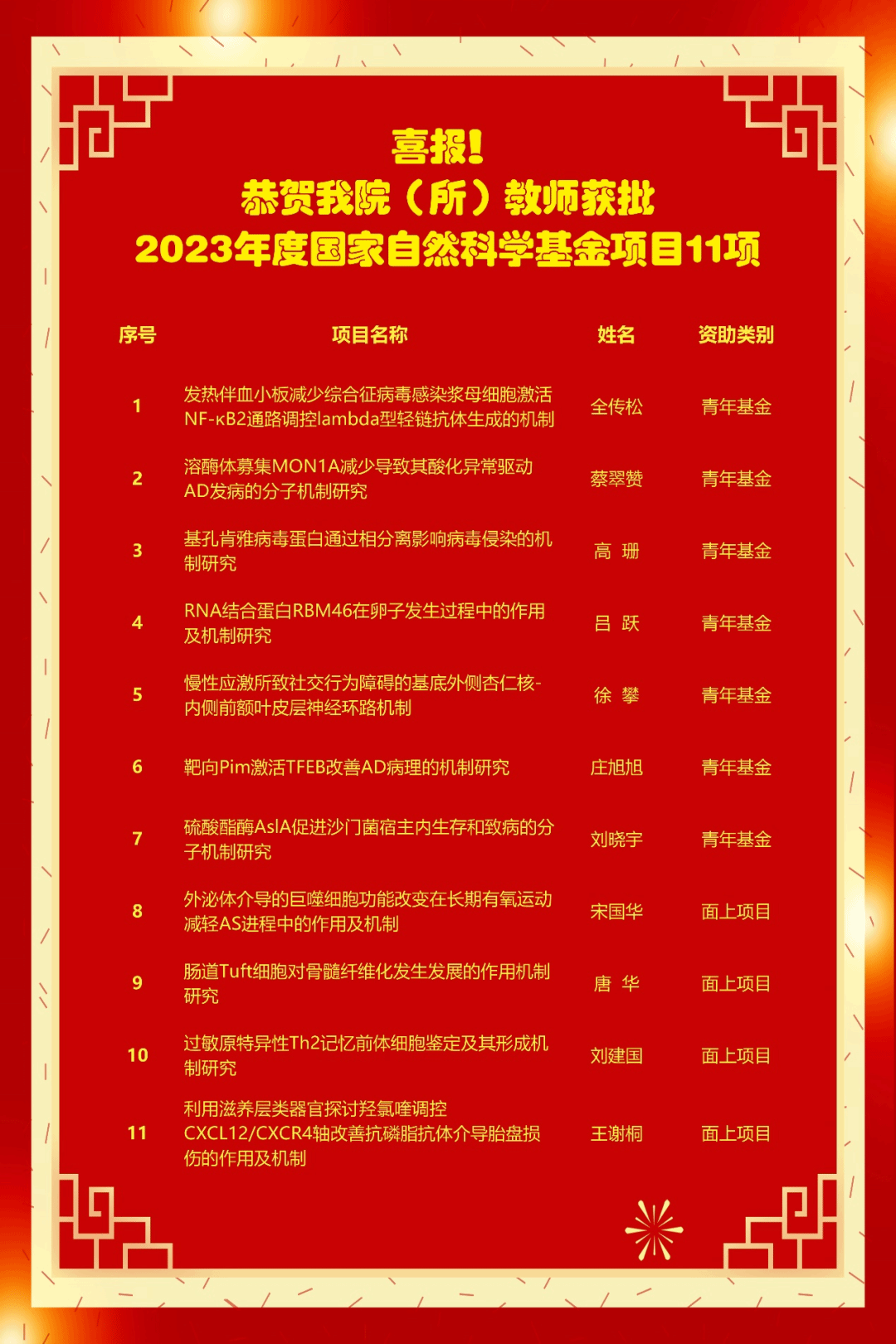 2023年度国家自然科学基金项目评审结果于8月24日揭晓。今年公司(所)教师共申请项目43项,获批11项,中标率25.58%。获批项目包括面上项目4项、青年项目7项,获批经费总额406万元。对获得资助的项目负责人和项目组表示热烈祝贺!