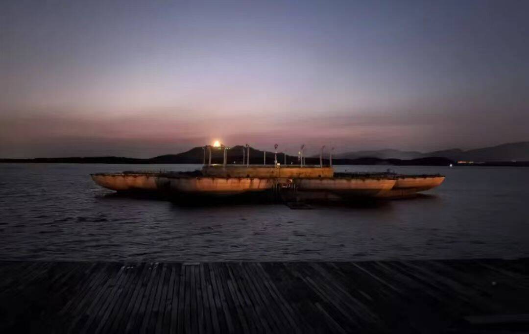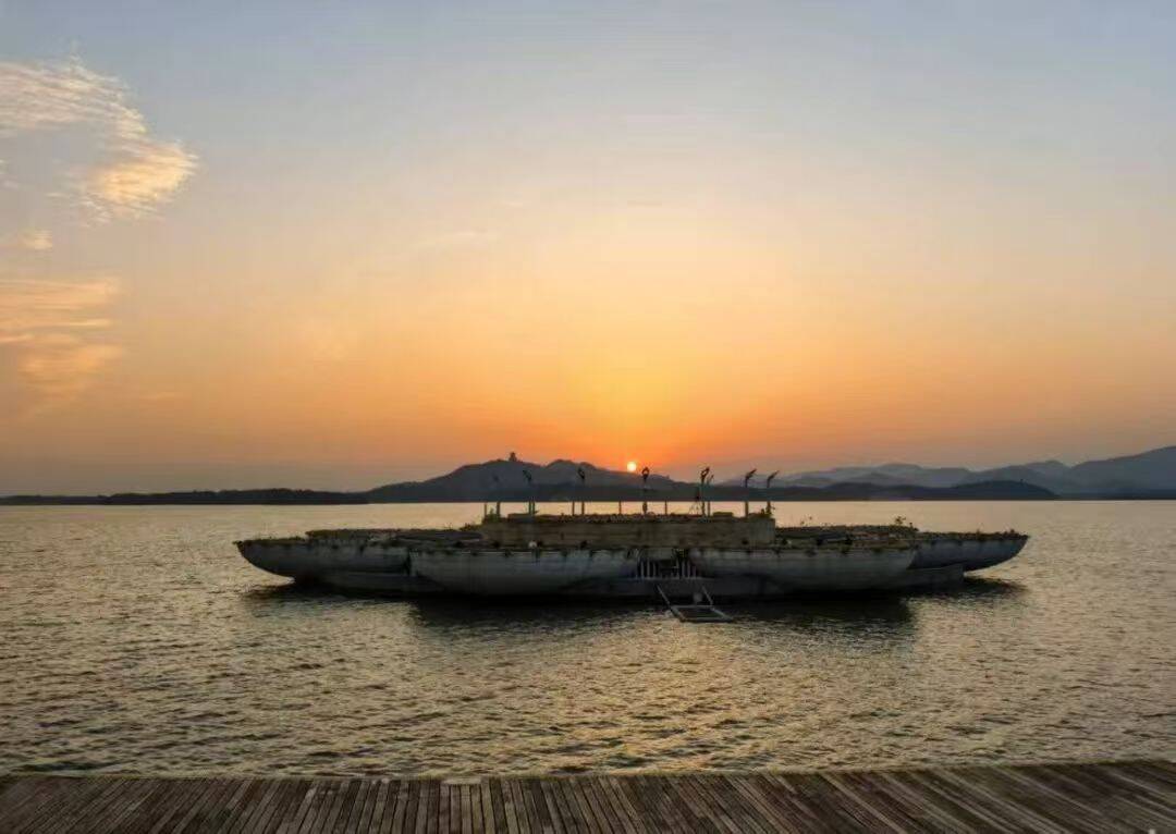 湖中的浮岛,在晨曦的轻抚下,渐渐从朦胧的夜色中苏醒。
