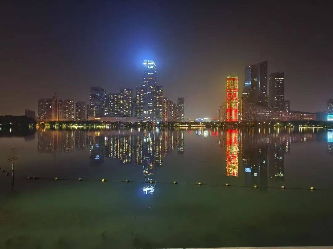 欣赏着五彩斑斓的灯光,倒映在湖面上,如梦如幻。