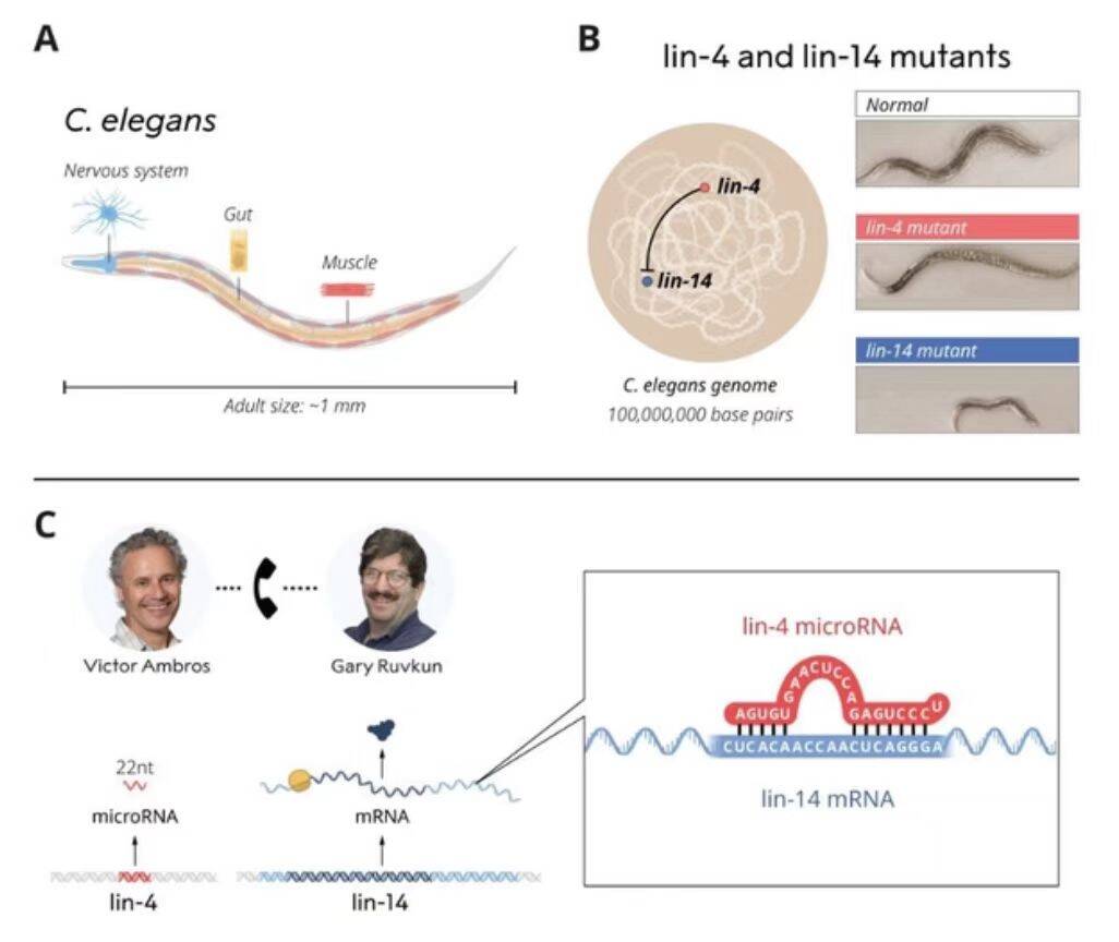 早在20世纪80年代末,维克托·安布罗斯和加里·鲁夫坎研究了一种长度仅为1毫米的线虫——小蠕虫秀丽隐杆线虫(C.elegans)。在这个研究中,维克托·安布罗斯和加里·鲁夫坎对控制不同遗传程序激活时间的基因产生了兴趣。他们研究了两种突变线虫品系,lin-4和lin-14,发现lin-4基因似乎是lin-14基因的负调节因子,但如何抑制lin-14的活性仍不清楚。经过深入研究,他们揭示了lin-4基因产生了一种异常短的核糖核酸分子,这种核糖核酸不编码蛋白质,却能够抑制lin-14的活性。最终,两位科学家确认了lin-4微小核糖核酸通过与lin-14信使核糖核酸(mRNA)中的互补序列结合,关闭lin-14从而阻止lin-14蛋白的生产。这一发现于1993年在国际学术期刊《细胞》(Cell)上发表。不过,这一研究成果的发表起初并没有在科学界产生很大的反响。然而,他们没有被质疑和挫折所打倒,而是凭借着坚定的信念和顽强的毅力,在科学的道路上执着前行。他们犹如无畏的探险家,在未知的领域中勇敢地开拓,用智慧和汗水书写着属于自己的传奇。