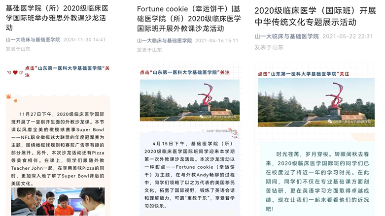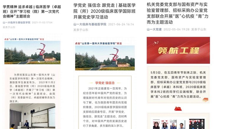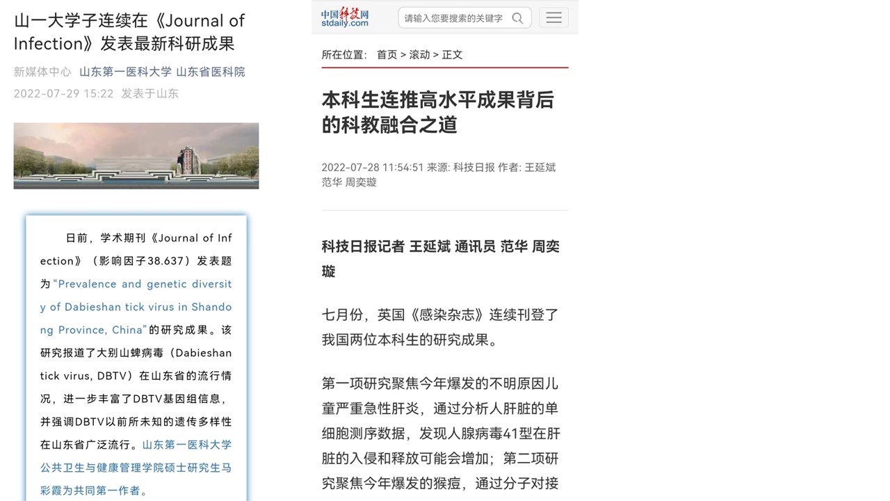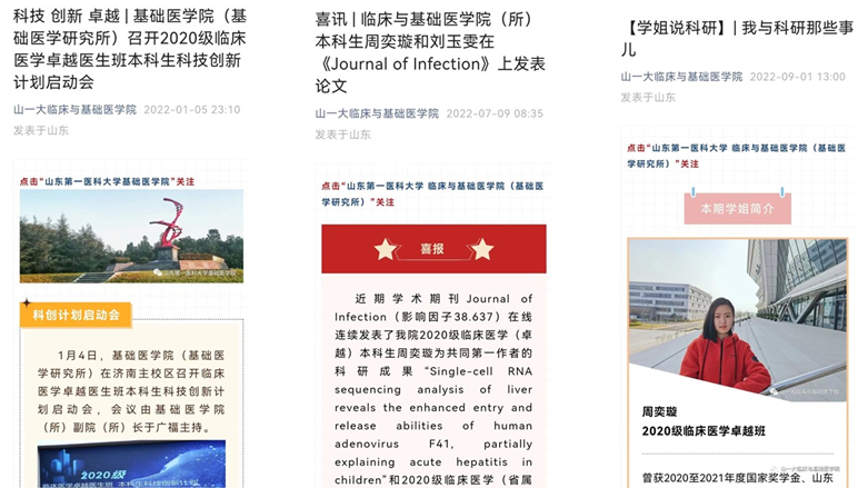 依靠院(所)“临床医学卓越医生班本科生科技创新计划,团支部同学积极参与科研,将所学应用到实践中,打开一扇新的大门。班级成员进入25个课题组跟随导师学习知识和实验技能,提高文献阅读能力,完成了有价值、有意义的科研立项,参与发表了国内、国际论文8篇 ,其中团支部书记参与在Journal of Infection上发表Single-cell RNA sequencing analysis of liver reveals the enhanced entry and release abilities of human adenovirus F41, partially explaining acute hepatitis in children(影响因子38.637),科技日报、齐鲁壹点、闪电新闻等校主流媒体进行了报道。