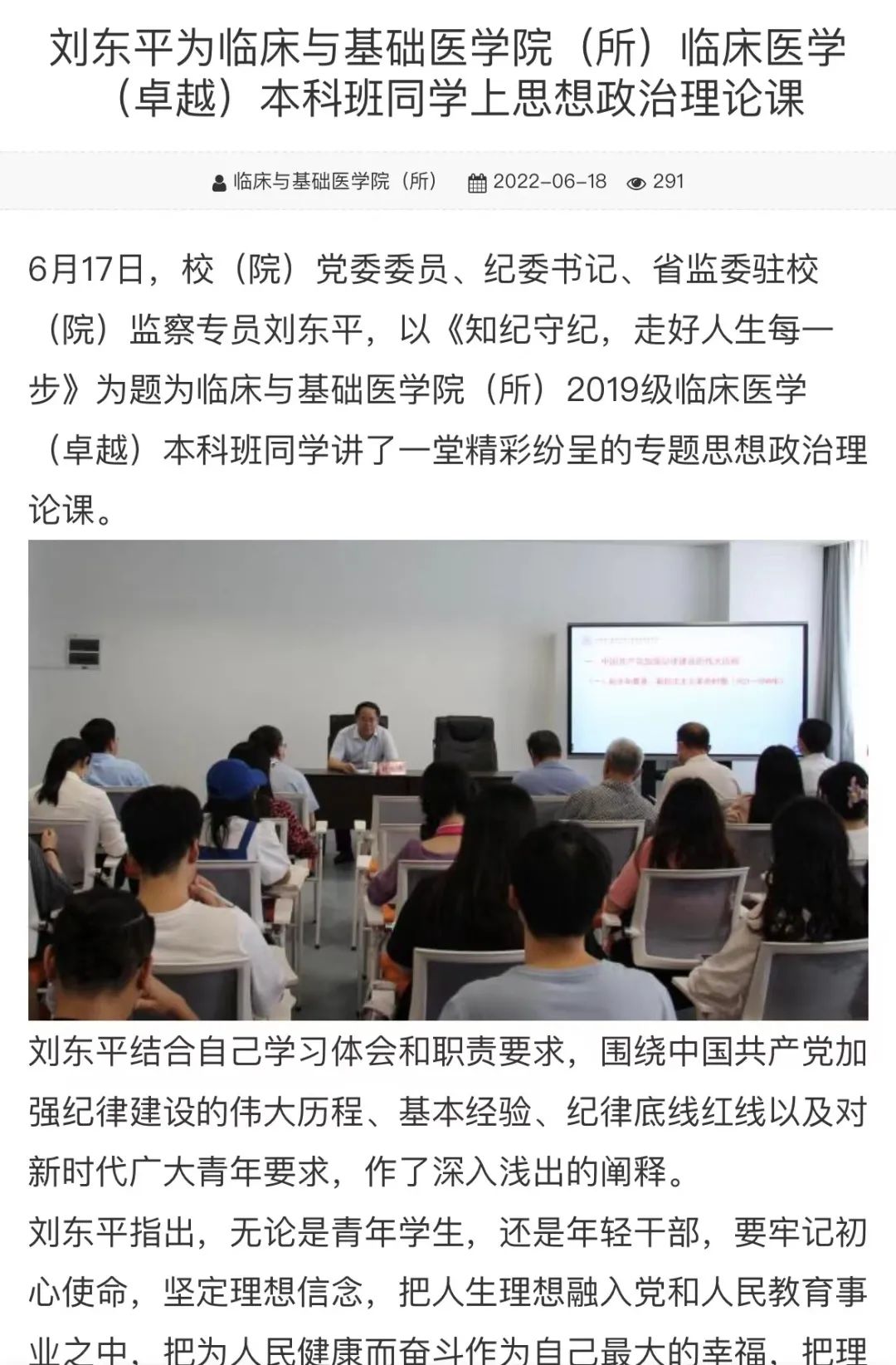 图2 刘东平为三亿体育临床医学(卓越)本科班同学上思想政治理论课