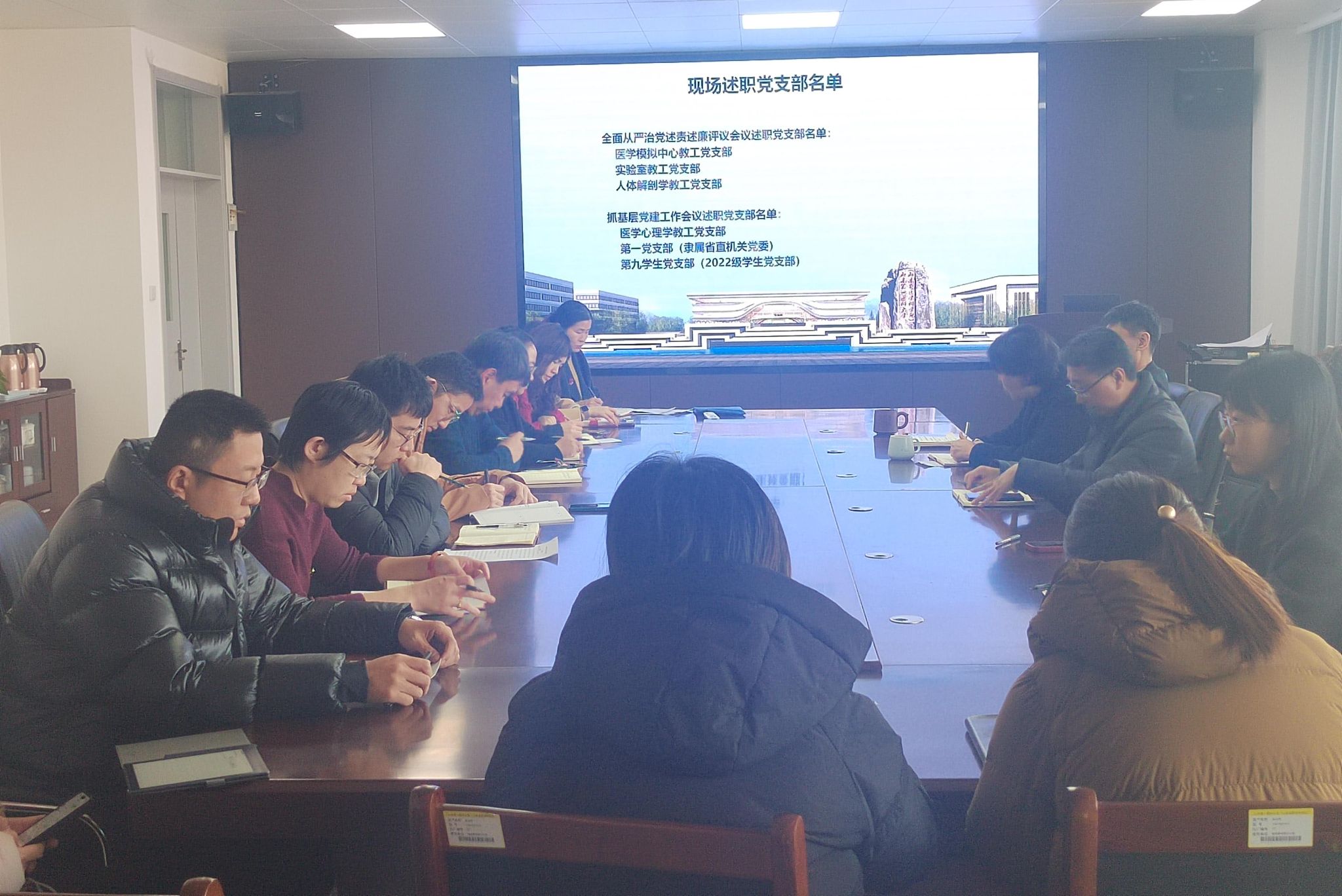 会上,医学模拟中心教工党支部、实验室教工党支部、人体解剖学教工党支部、医学心理学教工党支部、第一党支部(隶属省直机关党委)、第九员工党支部等6个党支部进行了现场述职,19个党支部书记进行了书面述职。张海东对现场述职的6名同志逐一点评。