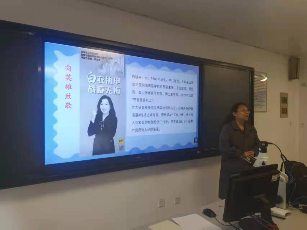 在这次见面会中,党支部书记苗芳作了题为《夯实基础,抗击疫情》的主题讲座。首先,苗芳老师给同学们介绍了公司优秀共产党员、山一大精神楷模白晓卉同志的感人事迹,并从疫情防控、个人防护注意事项、听从公司的通知安排等几个方面对同学们提出了要求,希望同学们认真学习白晓卉同志的先进事迹和优秀品质,以先进典型为榜样,学先进、赶先进、当先进,大力弘扬和自觉践行“自强不息”的山一大精神,牢记初心使命,矢志奋斗拼搏,学好医学,深爱医学。
