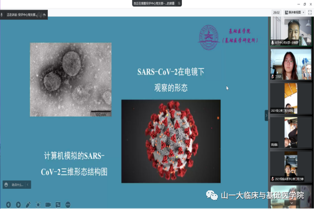 在活动中,党支部书记许晓群首先传达基层党支部联系员工班级“领航工程”的指导思想、实施方案和行动计划,表示党支部将作为同学们的领航员,积极服务同学、关心同学,建立党支部联系班级服务同学的长效机制。随后,与同学们分享了新冠疫情的相关知识,并对新冠病毒的基因组成、生活周期、传播途径、检测方法、防护手段、治疗措施以及当前国内和周边新冠疫情发展形势,分别做了详细阐述。在讲到检测方法时,支部党员与同学们重温了优秀共产党员、“山一大精神楷模”白晓卉同志的先进事迹。