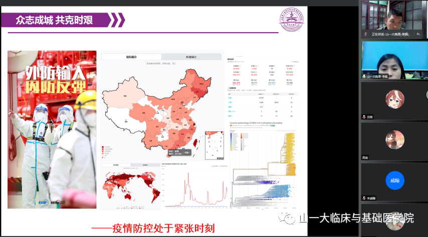 党支部书记张振杰首先为同学们传达并解读了当前公司疫情防控工作的精神和措施。支部党员、病原生物学系赵英会主任给同学们介绍了病原系的情况,鼓励同学们积极申报课题或者参加比赛。李娟老师从自己的专业角度为大家详细解读了当前全球和国内新冠疫情的严峻形势,分析了新冠病毒的演变历程。最后,周宏老师为大家分享了抗疫短视频《防线》,让防疫宣传变得更接地气、更走心,也更有效地提高了大家疫情防控的意识。