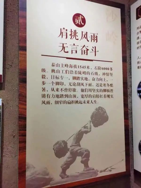 活动中,大家一起参观了泰山“挑山工”博物馆。沙岭村是泰山挑山工的发源地,史料记载,三千多年前这个村就有了“挑山工”。“在陡直的似乎没有尽头的山道上,一个穿红背心的挑山工被肩头的重物压弯了腰,他一步一步地向上登攀。”年逾70的张大伯向我们讲述,他20几岁就成为了挑山工,干了几十年,年龄大了才将担子传给了村里的年轻人。正是一代代的挑山工,无论严寒酷暑,沿着陡峭的石阶,目标专一,脚踏实地,孕育出“埋头苦干、勇挑重担、永不懈怠、一往无前”的泰山“挑山工”精神。在中国共产党的正确领导下,沙岭村这个昔日交通闭塞、经济落后的穷山村早已今非昔比。凭借挑山的毅力和精神,沙岭村拓宽了道路,修整了村居,修建了泰山螭霖鱼池,青山绿水中的沙岭村处处是景,步步入画,发生了翻天覆地的变化。