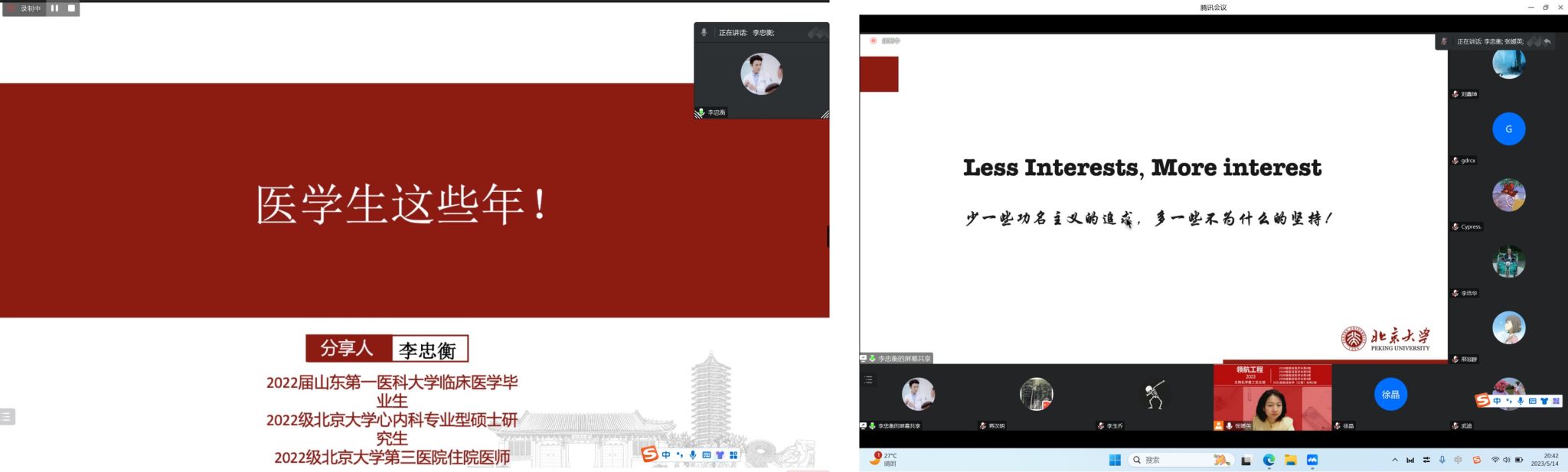 授人以鱼不如授人以渔。李忠衡,2017级临床医学本科毕业生,现就读于北京大学第三医院2022级心内科专业硕士,他的讲解面面俱到,包括大一的医学入门、大二基础医学课程的学习、大三基础-临床桥梁课程的过渡、大四临床课程见习以及大五医院实习的学习经历,员工会、社团、外国语学术竞赛等课余生活以及医员工的职业发展方向,还包括专业课和英语学习方法、本科生科研指南、综述撰写及考研经验的获取途径等多方面。同时,李忠衡总结了三点心得体会:第一,要有明确的目标并规划适合自己的道路;第二,保持专注力;第三,“耐得住寂寞”与“慎独”。最后,他鼓励学弟学妹们要成为行动派,提高自主学习的能力,在今后的求学之路上少一些功名主义的追求,多一些不为什么的坚持。