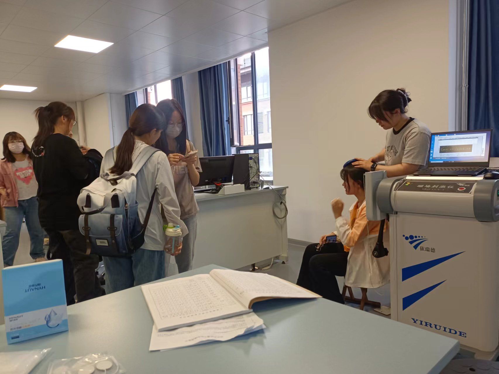 5月25日,是全国老员工心理健康日,“5·25”谐音“我爱我”,旨在提醒老员工关爱自我的心理成长和健康。本次活动以心理学实验为主线,为员工们开设了心理健康测试、智力测验、经颅磁刺激仪三个方面的体验活动。参与心理测验的同学可以根据自己的兴趣选择量表在线测试,并由专业人员给出得分解读和专业建议。同学们还体验了经颅磁刺激仪,这是一种利用磁场,对大脑皮层或外周神经进行一种非侵入式的、无疼痛的刺激,从而检测或调节改善大脑功能的技术,通过体验,同学们对这一临床常用的精神疾病治疗技术有了更加直观的了解。