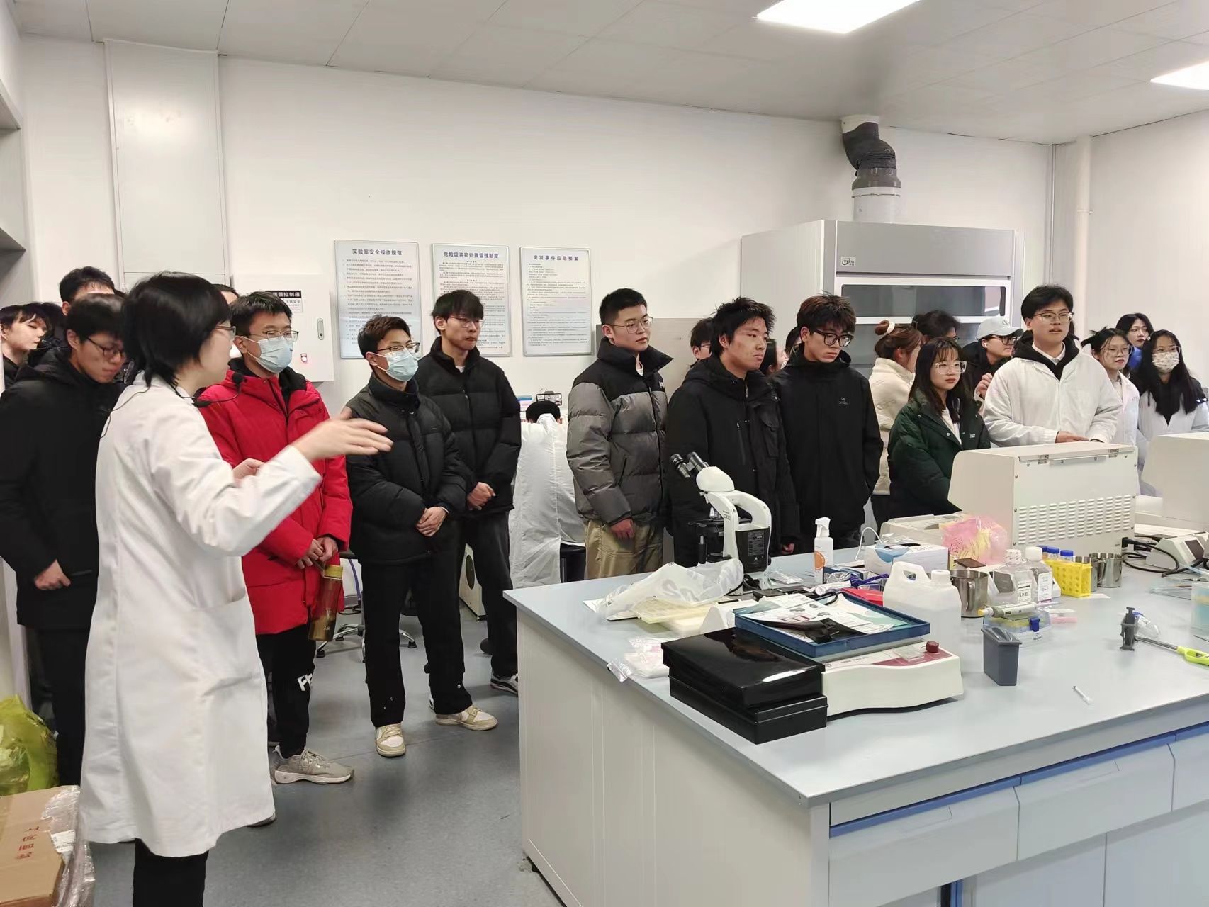 活动伊始,韩琛老师就实验室安全及规章制度进行了详细地讲解,强调重视安全性是开展科研活动的前提。之后同学们走进实验室,近距离接触并观看多种大型科研及教学仪器设备的操作,了解各类仪器的工作原理及应用场景,现场观摩高年资博士后、硕博士等进行相应实验操作;同时,同学们进入细胞培养间实地了解细胞培养对操作环境的要求,书本上的知识生动形象地展现在面前,同学们的各种疑惑也被逐一解答。