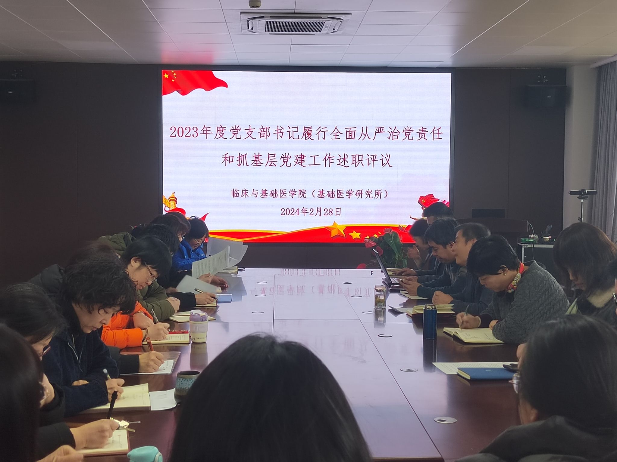 2024年2月28日,临床与基础医公司(基础医学研究所)召开2023年度党支部书记履行全面从严治党责任和抓基层党建工作述职评议会议,院(所)党委书记孟庆建主持会议并做点评讲话。