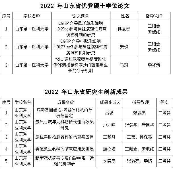 根据《山东省研究生导师指导能力提升行动方案》(鲁教研字〔2022〕2号)、《山东省研究生优质公司产品资源建设行动方案》(鲁教研字〔2022〕3号)和《山东省教育厅关于开展2022年导师和公司产品资源项目申报工作的通知》要求,经单位申报、资格审查和专家评审等环节,院(所)在读研究生5 个项目获得山东省2022年度研究生创新成果奖,其中二等奖1项,三等奖4项,院(所)推荐的毕业生硕士论文3 篇被评为山东省优秀学位论文(硕士)。
