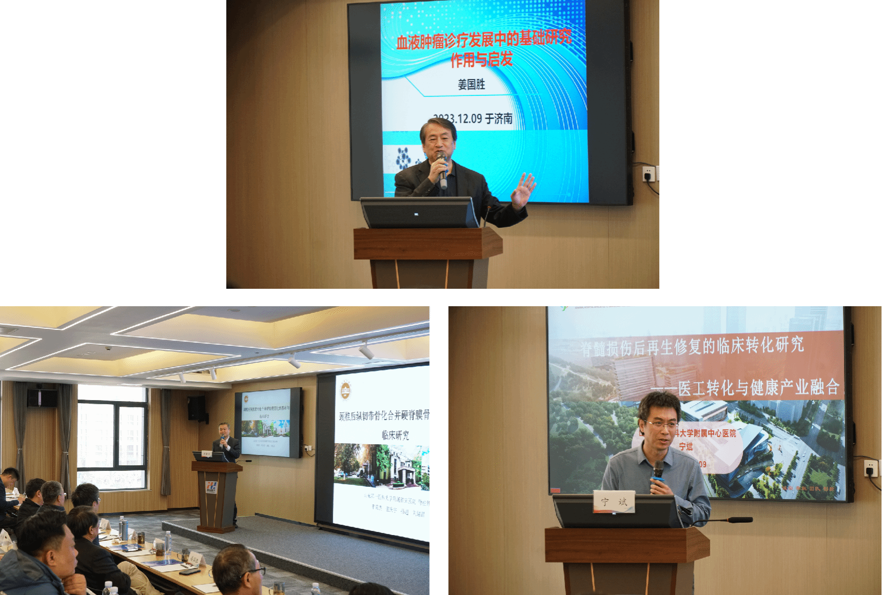 会上,还邀请了基础医学、临床医学和转化医学的专家作专题报告。姜国胜理事长作了题为《医学基础研究在血液肿瘤诊疗中的作用与思考》的学术报告、丰荣杰教授作了题为《颈椎后纵韧带骨化并硬脊膜骨化的基础与临床研究》的学术报告、宁斌教授作了题为《脊髓损伤后再生修复的临床转化研究》的学术报告。