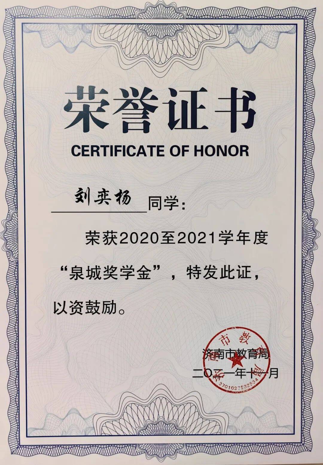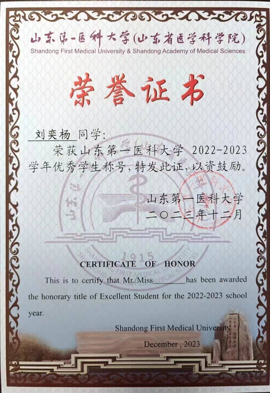 2019年入校以来,刘奕杨始终牢记“健康所系,性命所托”医学誓言,秉持“脚踏实地,勇攀高峰”求学精神,遵循“跬步千里,止于至善”的校训,在学业成绩方面取得突破,曾获济南奖学金、弘毅奖学金、校级奖学金等奖励,今年高分被首都医科大学录取。