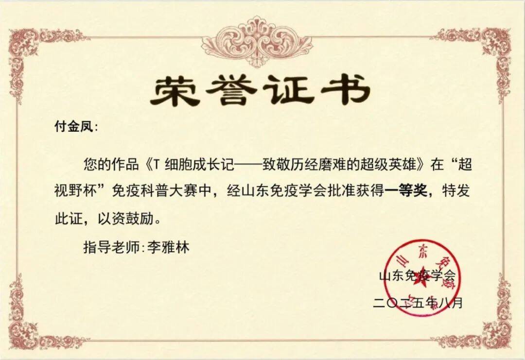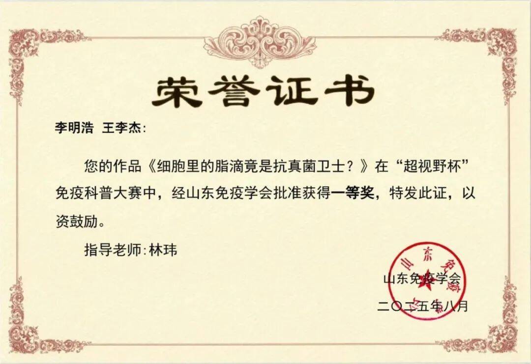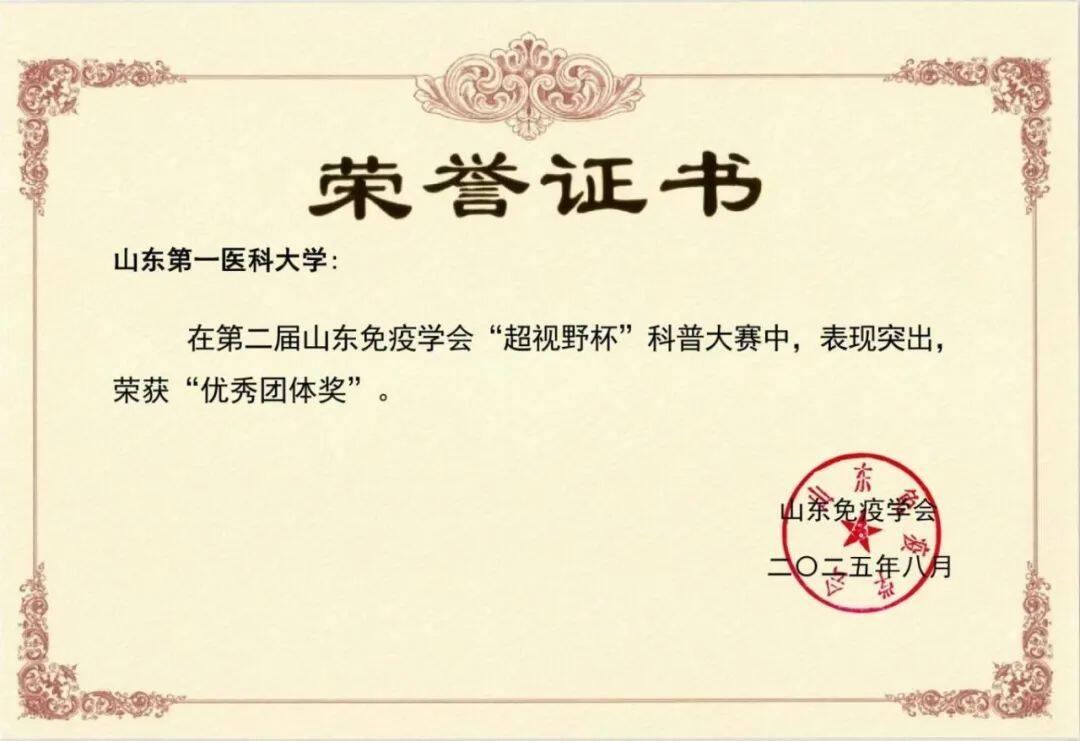 2025年8月16日,由山东免疫学会主办,山东第二医科大学承办的山东免疫学会教学与科普工作委员会2025年联合学术年会在潍坊召开,同期举办了第二届山东免疫学会“超视野杯”科普大赛。省内外高校、科研院所、医疗机构、企业20多家单位68份作品参加此次活动。公司(院)三亿体育师生在科普大赛中表现优异,荣获“优秀团体奖”,斩获一等奖2项、二等奖5项、三等奖9项,充分展现了院(所)在免疫学科普教育与实践中的实力。